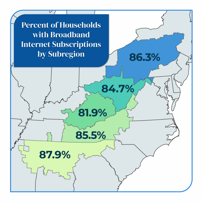 Broadband or high-speed Internet access helps people pursue learning, telework and more. During 2019-2023, 86.2% of Appalachian households had a broadband Internet subscription, compared to 89.7% nationwide. In 116 Appalachian counties, less than 80% of households had a broadband subscription.
