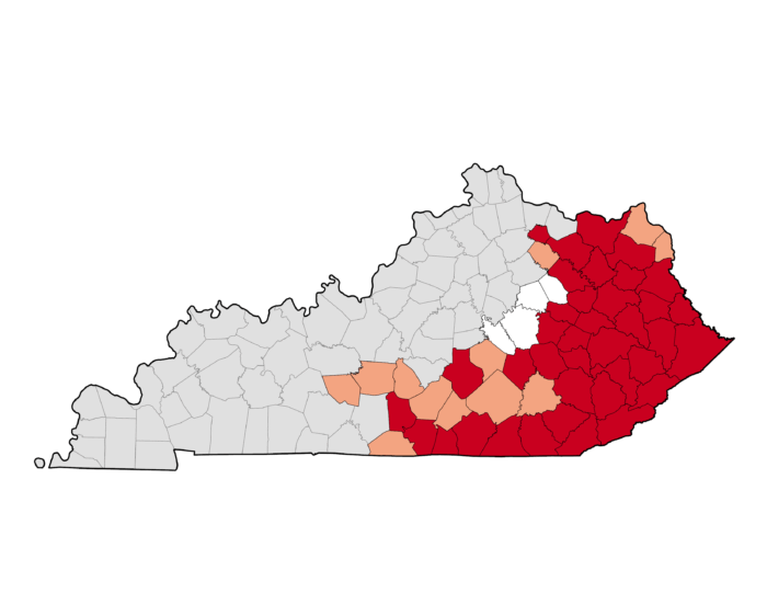 (54 out of 120 counties): Adair, Bath, Bell, Boyd, Breathitt, Carter, Casey, Clark, Clay, Clinton, Cumberland, Edmonson, Elliott, Estill, Fleming, Floyd, Garrard, Green, Greenup, Harlan, Hart, Jackson, Johnson, Knott, Knox, Laurel, Lawrence, Lee, Leslie, Letcher, Lewis, Lincoln, McCreary, Madison, Magoffin, Martin, Menifee, Metcalfe, Monroe, Montgomery, Morgan, Nicholas, Owsley, Perry, Pike, Powell, Pulaski, Robertson, Rockcastle, Rowan, Russell, Wayne, Whitley, and Wolfe