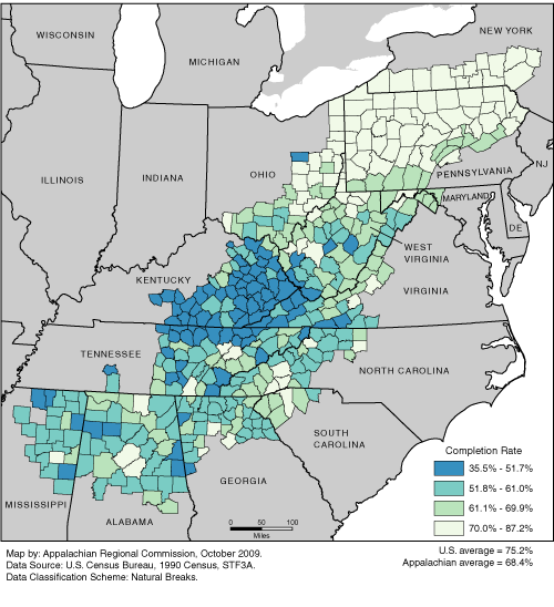 A high school completion rate is the percentage of adults, 25 years and over, completing 12 years or more of school. The map uses natural breaks in the distribution to organize the data into groups of common values. Appalachian high school completion rates range from 35.5% to 87.2%. The Appalachian average is 68.4%. The U.S. average is 75.2%. For a list of county data by state, see the downloadable Excel file.