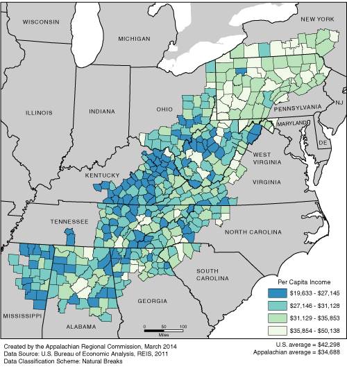 The Appalachian per capita income rates range from $19,633, to $50,138. The Appalachian average is $34,688. The U.S. average is $42,298. For a list of county data by state, see the downloadable Excel file.