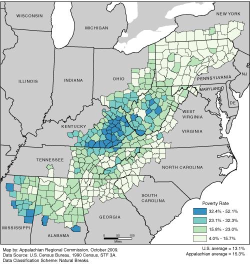A poverty rate is the ratio of the persons below the poverty level to the total number of persons for whom poverty status has been determined. The map uses natural breaks in the distribution to organize the data into groups of common values. Appalachian poverty rates range from 4.0% to 52.1%. The Appalachian average is 15.3%. The U.S. average is 13.1%. For a list of county data by state, see the downloadable Excel file.