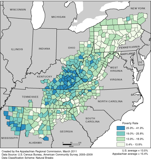 A poverty rate is the ratio of the persons below the poverty level to the total number of persons for whom poverty status has been determined. The map uses natural breaks in the distribution to organize the data into groups of common values. Appalachian poverty rates range from 5.4% to 41.9%. The Appalachian average is 15.4%. The U.S. average is 13.5%. For a list of county data by state, see the downloadable Excel file.