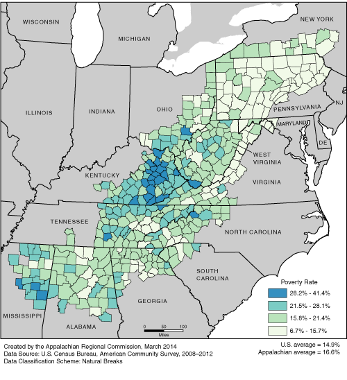 Appalachian poverty rates range from 6.7% to 41.4%. The Appalachian average is 16.6%. The U.S. average is 14.9%. For a list of county data by state, see the downloadable Excel file.