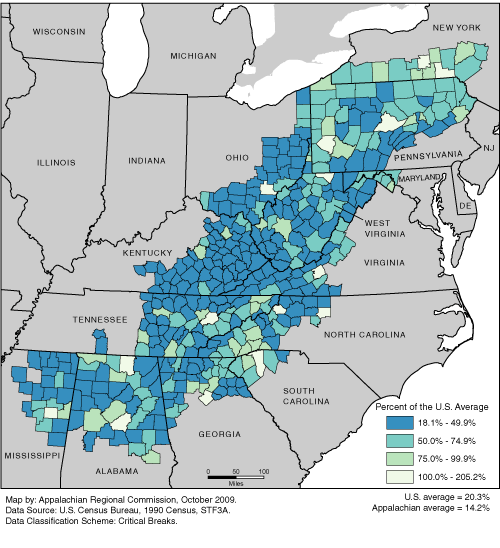 A college completion rate is the percentage of adults, 25 years and over, completing four years of college or more. The percent of the U.S. average is computed by dividing the county college completion rate by the national average and multiplying by 100. The map uses critical breaks such as the national average to organize the data into groups of common values. The Appalachian rates range from 18.1% to 205.2% of the U.S. average. The U.S. average is 20.3%. The Appalachian average is 14.2%. For a list of county data by state, see the downloadable Excel file.