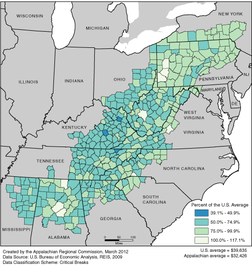 Per capita income is a measure of the total personal income of an area divided by the resident population of the area. The percent of the U.S. average is computed by dividing the county per capita income by the national average and multiplying by 100. The map uses critical breaks such as the national average to organize the data into groups of common values. The Appalachian rates range from 39.1% to 117.1% of the U.S average. The U.S. average is $39,635. The Appalachian average is $32,426. For a list of county data by state, see the downloadable Excel file.