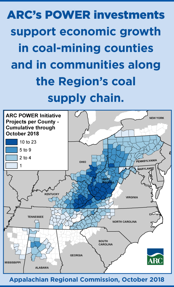 WASHINGTON, D.C., October 11, 2018—Today, the Appalachian Regional Commission (ARC) announced $26.5 million to expand and diversify the economy in Appalachia’s coal-impacted communities through the POWER (Partnerships for Opportunity and Workforce and Economic Revitalization) Initiative. These 35 awards are projected to create or retain over 5,400 jobs and leverage more than $193 million in private investment into 59 of the Region’s coal-impacted counties by supporting workforce training and education in manufacturing, technology, healthcare, and other industry sectors. They also invest in infrastructure enhancements to continue developing the Region’s tourism, entrepreneurial, and agriculture sectors, as well as increase access to community-based capital, including impact-investing funds, venture capital, and angel investment streams.