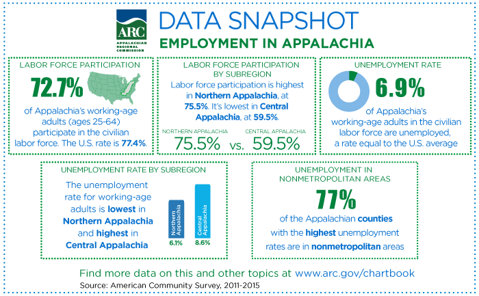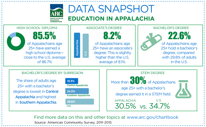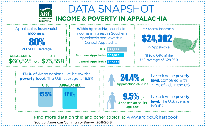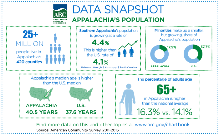 This study examines state- and county-level data on population, age, race and ethnicity, housing occupancy and housing tenure, education, labor force, employment and unemployment, income and poverty, health insurance coverage, disability status, migration patterns, and veteran status from the 2011-2015 American Community Survey (ACS) for the 13 Appalachian states. Information is summarized for five Appalachian subregions and five metro designations. The study includes ACS data topics that were in the 2010 decennial census, as well as others that are no longer available in the census, to provide a comparable time series of data for all counties in Appalachia. The report compares two non-overlapping five-year periods and allows for the study of trends in the data.
