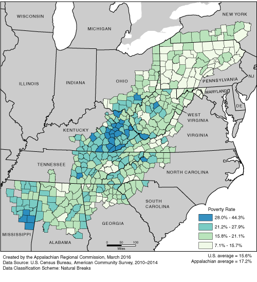 Appalachian poverty rates range from 7.1% to 44.3%. The Appalachian average is 17.2%. The U.S. average is 15.6%. For a list of county data by state, see the downloadable Excel file.
