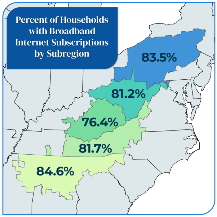 Broadband or high-speed Internet access helps people pursue learning, telework and more. During 2019-2023, 86.2% of Appalachian households had a broadband Internet subscription, compared to 89.7% nationwide. In 116 Appalachian counties, less than 80% of households had a broadband subscription.