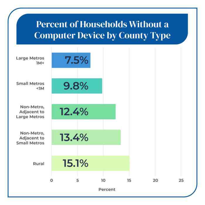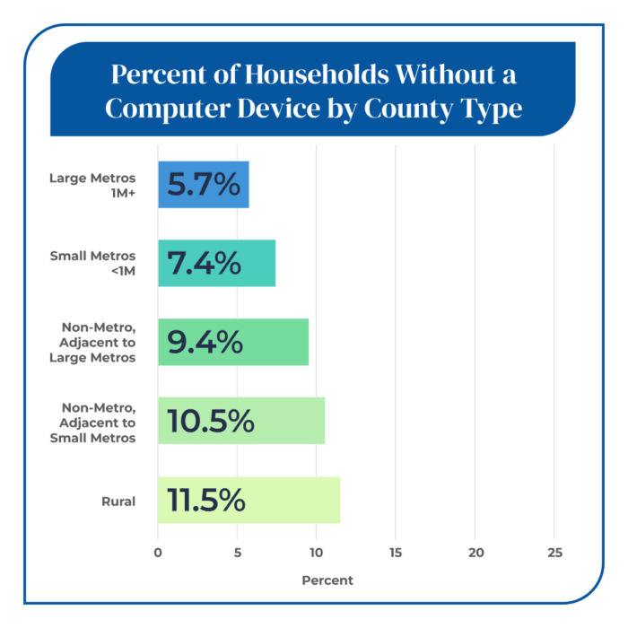 Despite increasing to 92% of households with a computer device, Appalachia remains nearly three points below the nation. Only 30 counties were at or above the national average; nearly half were in large metropolitan areas.