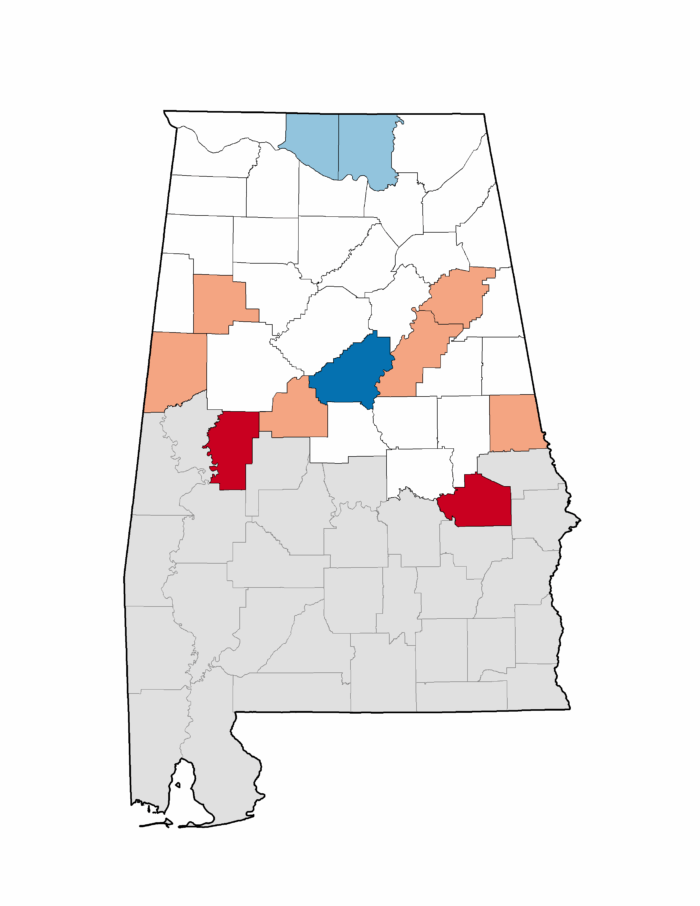 (37 out of 67 counties): Bibb, Blount, Calhoun, Chambers, Cherokee, Chilton, Clay, Cleburne, Colbert, Coosa, Cullman, De Kalb, Elmore, Etowah, Fayette, Franklin, Hale, Jackson, Jefferson, Lamar, Lauderdale, Lawrence, Limestone, Macon, Madison, Marion, Marshall, Morgan, Pickens, Randolph, St. Clair, Shelby, Talladega, Tallapoosa, Tuscaloosa, Walker, and Winston