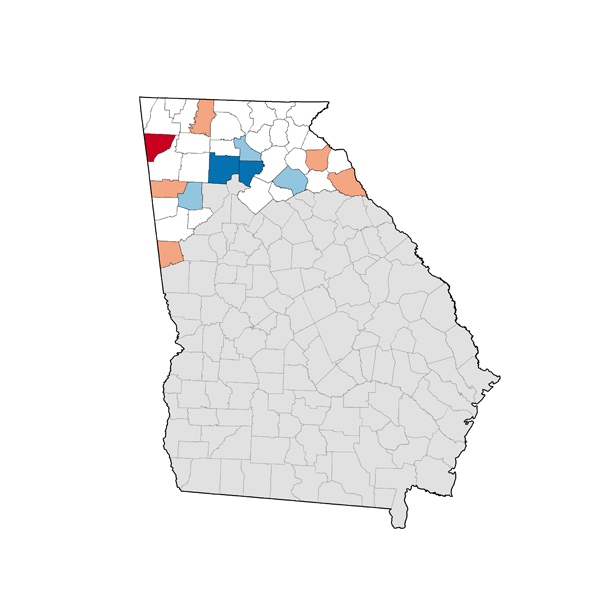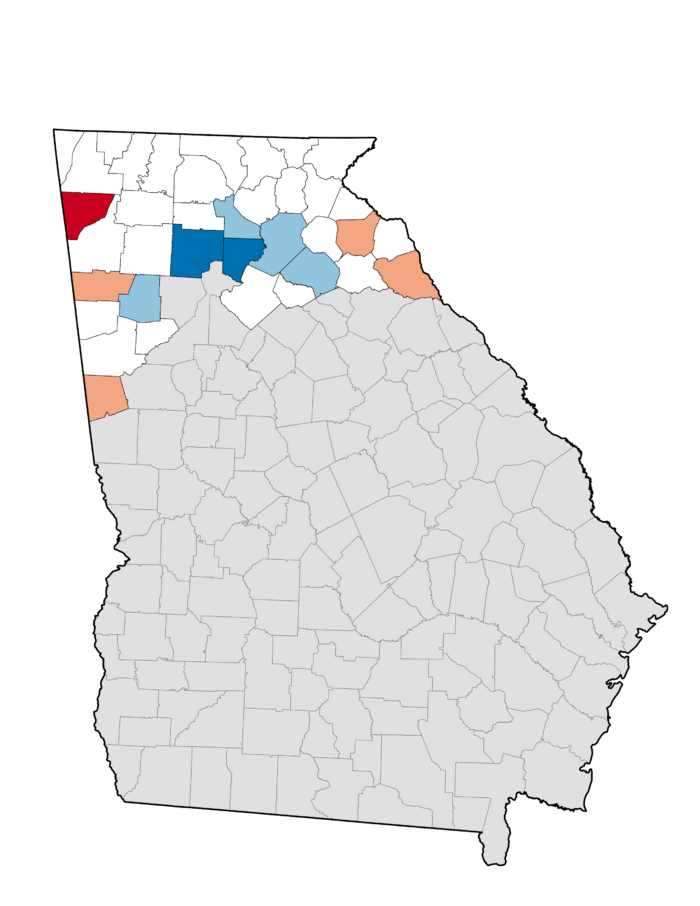 (37 out of 159 counties): Banks, Barrow, Bartow, Carroll, Catoosa, Chattooga, Cherokee, Dade, Dawson, Douglas, Elbert, Fannin, Floyd, Forsyth, Franklin, Gilmer, Gordon, Gwinnett, Habersham, Hall, Haralson, Hart, Heard, Jackson, Lumpkin, Madison, Murray, Paulding, Pickens, Polk, Rabun, Stephens, Towns, Union, Walker, White, and Whitfield