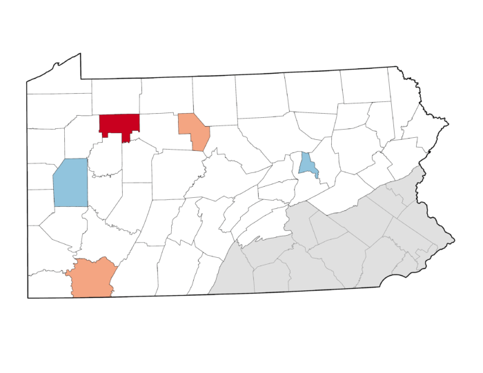 (52 out of 67 counties): Allegheny, Armstrong, Beaver, Bedford, Blair, Bradford, Butler, Cambria, Cameron, Carbon, Centre, Clarion, Clearfield, Clinton, Columbia, Crawford, Elk, Erie, Fayette, Forest, Fulton, Greene, Huntingdon, Indiana, Jefferson, Juniata, Lackawanna, Lawrence, Luzerne, Lycoming, McKean, Mercer, Mifflin, Monroe, Montour, Northumberland, Perry, Pike, Potter, Schuylkill, Snyder, Somerset, Sullivan, Susquehanna, Tioga, Union, Venango, Warren, Washington, Wayne, Westmoreland, and Wyoming