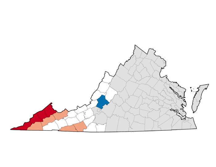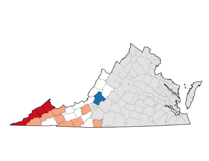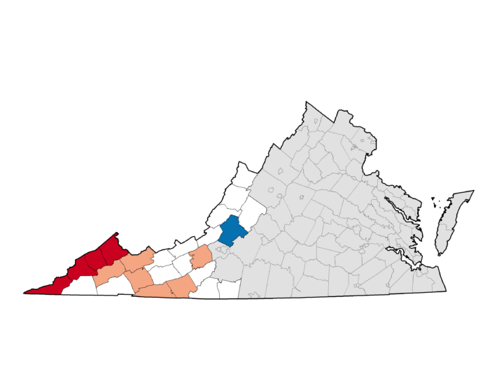 (25 out of 133 counties): Alleghany, Bath, Bland, Botetourt, Buchanan, Carroll, Craig, Dickenson, Floyd, Giles, Grayson, Henry, Highland, Lee, Montgomery, Patrick, Pulaski, Rockbridge, Russell, Scott, Smyth, Tazewell, Washington, Wise, and Wythe