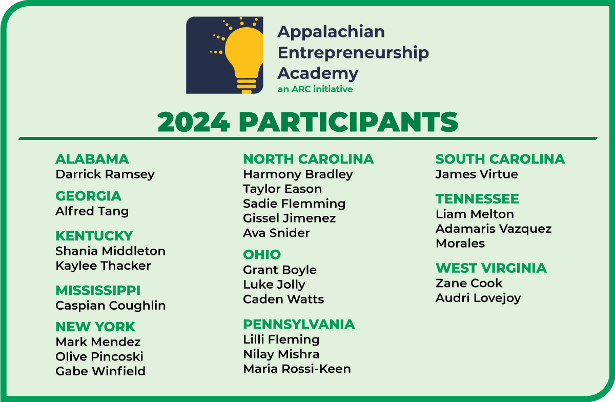ARC will celebrate the graduates of this year’s Appalachian Entrepreneurship Academy and Appalachian STEM Academy programs via social media starting on Friday, July 19 at 11:00 a.m. ET.