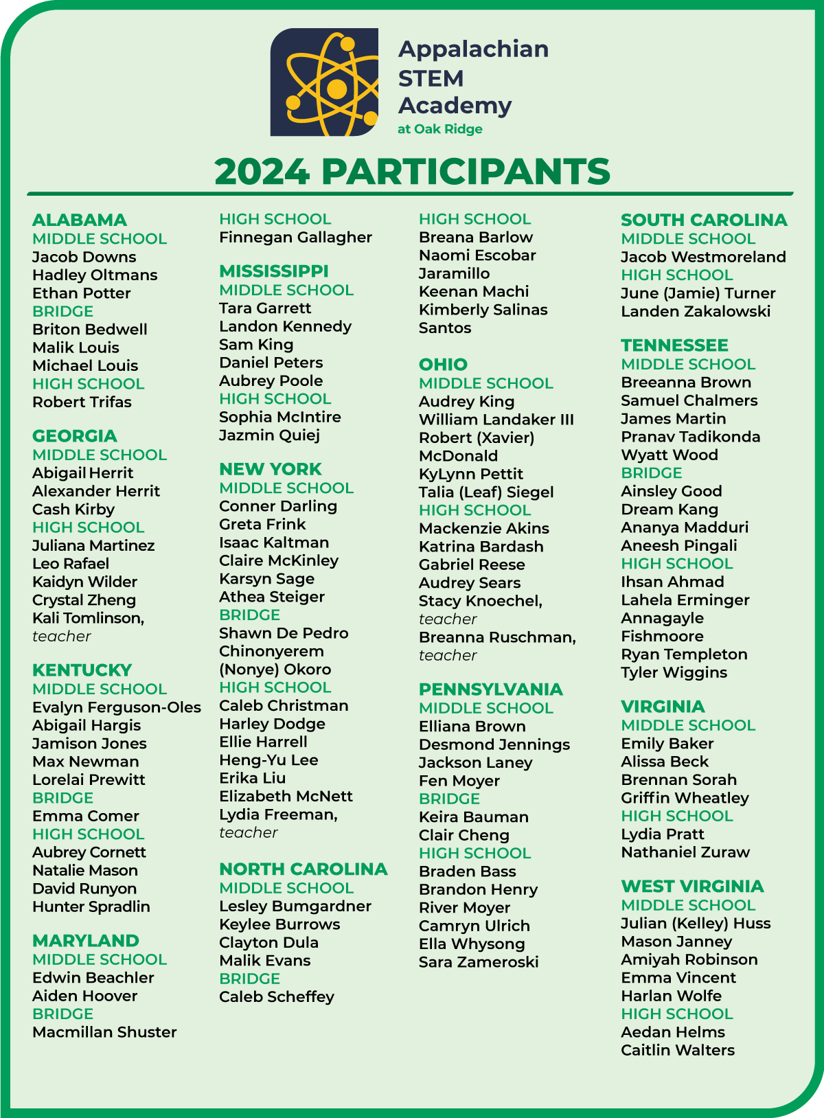 Congratulations to the [NUMBER] students and teachers from Appalachian [INSERT YOUR STATE] who graduated from Appalachian Regional Commission’s Appalachian Entrepreneurship Academy and Appalachian STEM Academy! AEA students developed innovative business solutions to regional challenges, and STEM students gained valuable exposure to research opportunities at the U.S. Department of Energy’s Oak Ridge National Laboratory.