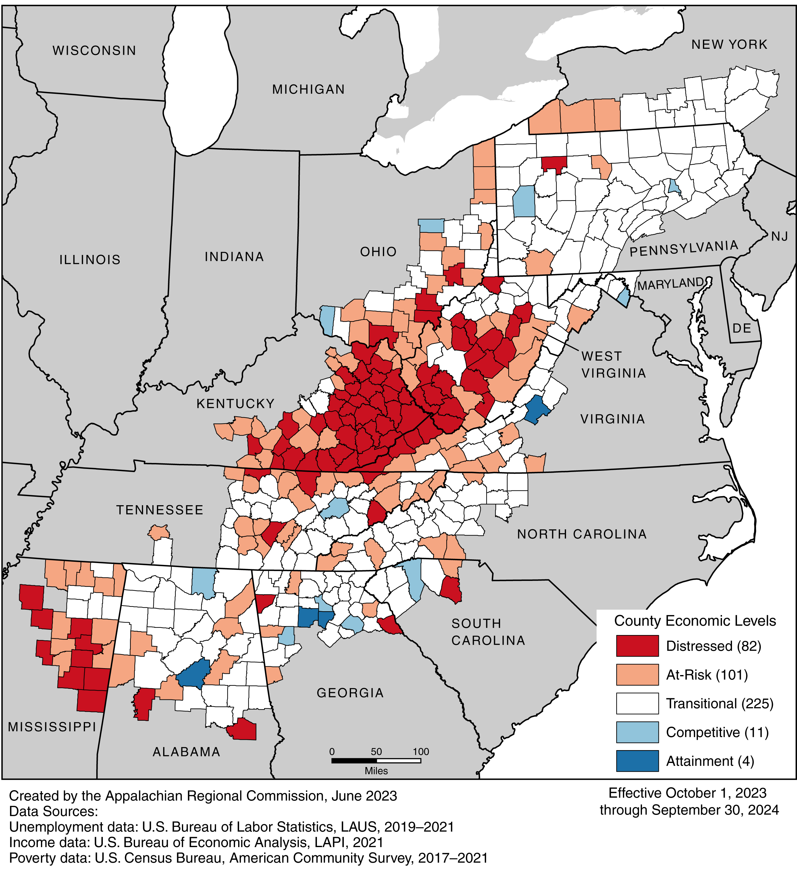 The Appalachian Regional Commission uses an index-based county economic classification system to identify and monitor the economic status of Appalachian counties. See the methodology for a description of each economic level.