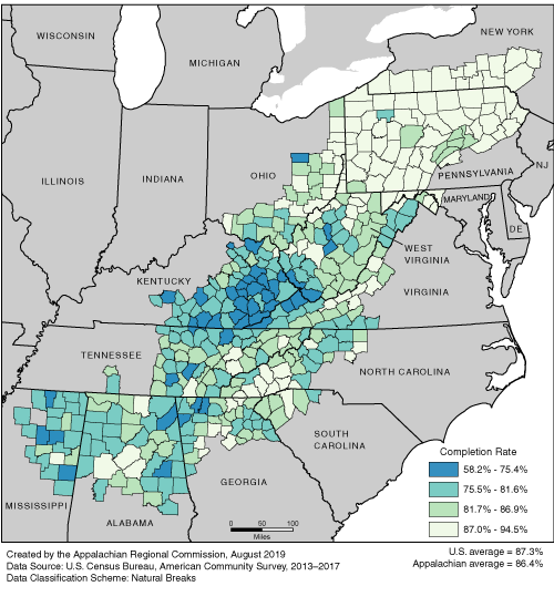 Appalachian high school completion rates range from 58.2% to 94.5%. The Appalachian average is 86.4%. The U.S. average is 87.3%. For a list of county data by state, see the downloadable Excel file.