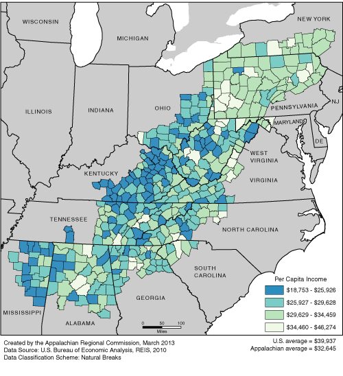 The Appalachian per capita income rates range from $18,753, to $46,274. The Appalachian average is $32,645. The U.S. average is $39,937. For a list of county data by state, see the downloadable Excel file.
