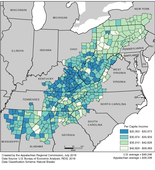 The Appalachian per capita income rates range from $20,353, to $58,369. The Appalachian average is $39,338. The U.S. average is $49,246. For a list of county data by state, see the downloadable Excel file.