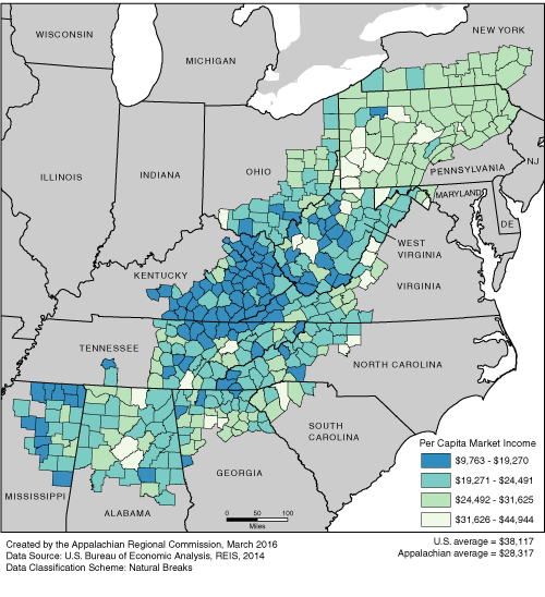The Appalachian per capita market income rates range from $9,763 to $44,944. The Appalachian average is $28,317. The U.S. average is $38,117. For a list of county data by state, see the downloadable Excel file.