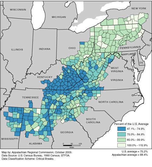 A high school completion rate is the percentage of adults, 25 years and over, completing 12 years or more of school. The percent of the U.S. average is computed by dividing the county high school completion rate by the national average and multiplying by 100. The map uses critical breaks such as the national average to organize the data into groups of common values. The Appalachian rates range from 47.1% to 115.9% of the U.S. average. The U.S. average is 75.2%. The Appalachian average is 68.4%. For a list of county data by state, see the downloadable Excel file.