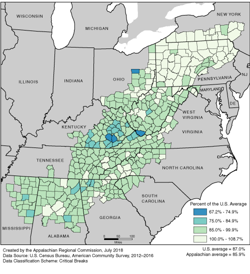 The Appalachian rates range from 67.2% to 108.7% of the U.S. average. The U.S. average is 87.0%. The Appalachian average is 85.9%. For a list of county data by state, see the downloadable Excel file.