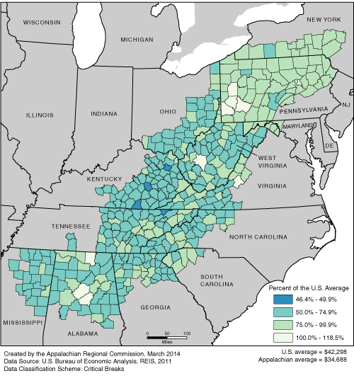 The Appalachian rates range from 46.4% to 118.5% of the U.S average. The U.S. average is $42,298. The Appalachian average is $34,688. For a list of county data by state, see the downloadable Excel file.