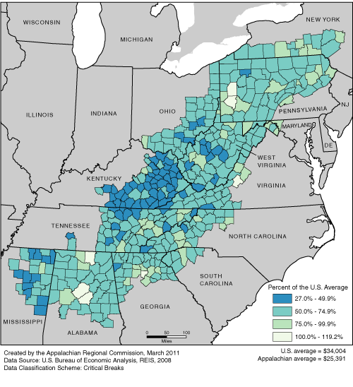 Per capita market income is a measure of an area’s total personal income, less transfer payments, divided by the resident population of the area. The percent of the U.S. average is computed by dividing the county per capita market income by the national average and multiplying by 100. The map uses critical breaks such as the national average to organize the data into groups of common values. The Appalachian rates range from 27.0% to 119.2% of the U.S. average. The U.S. average is $34,004. The Appalachian average is $25,391. For a list of county data by state, see the downloadable Excel file.