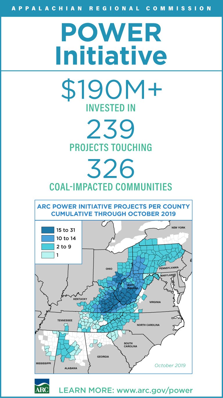 POWER (Partnerships for Opportunity and Workforce and Economic Revitalization) is a congressionally funded initiative that targets federal resources to help communities and regions that have been affected by job losses in coal mining, coal power plant operations, and coal-related supply chain industries due to the changing economics of America’s energy production. With today’s announcement, ARC has invested over $190 million in 239 projects touching 326 counties across Appalachia. ARC is working with Chamberlin/Dunn LLC, a third-party research firm, to monitor, analyze, and evaluate these investments.