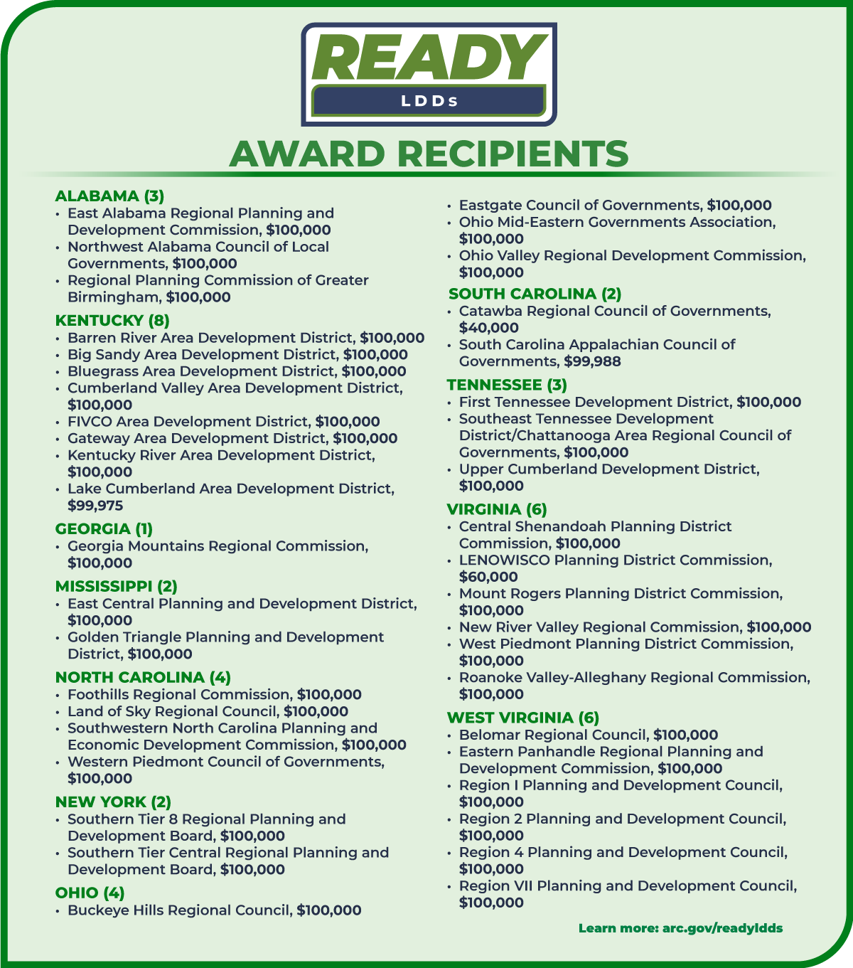 Supported with funding from the Bipartisan Infrastructure Law, READY Community Foundations is the fourth and final learning track of READY Appalachia. Since July 2022, training and funding opportunities have been provided to 41 local development districts (LDDs), 75 nonprofit organizations and 88 local government entities. Awards include $4 million through READY LDDs and $1.6 million through READY Nonprofits, with more expected through READY Local Governments.