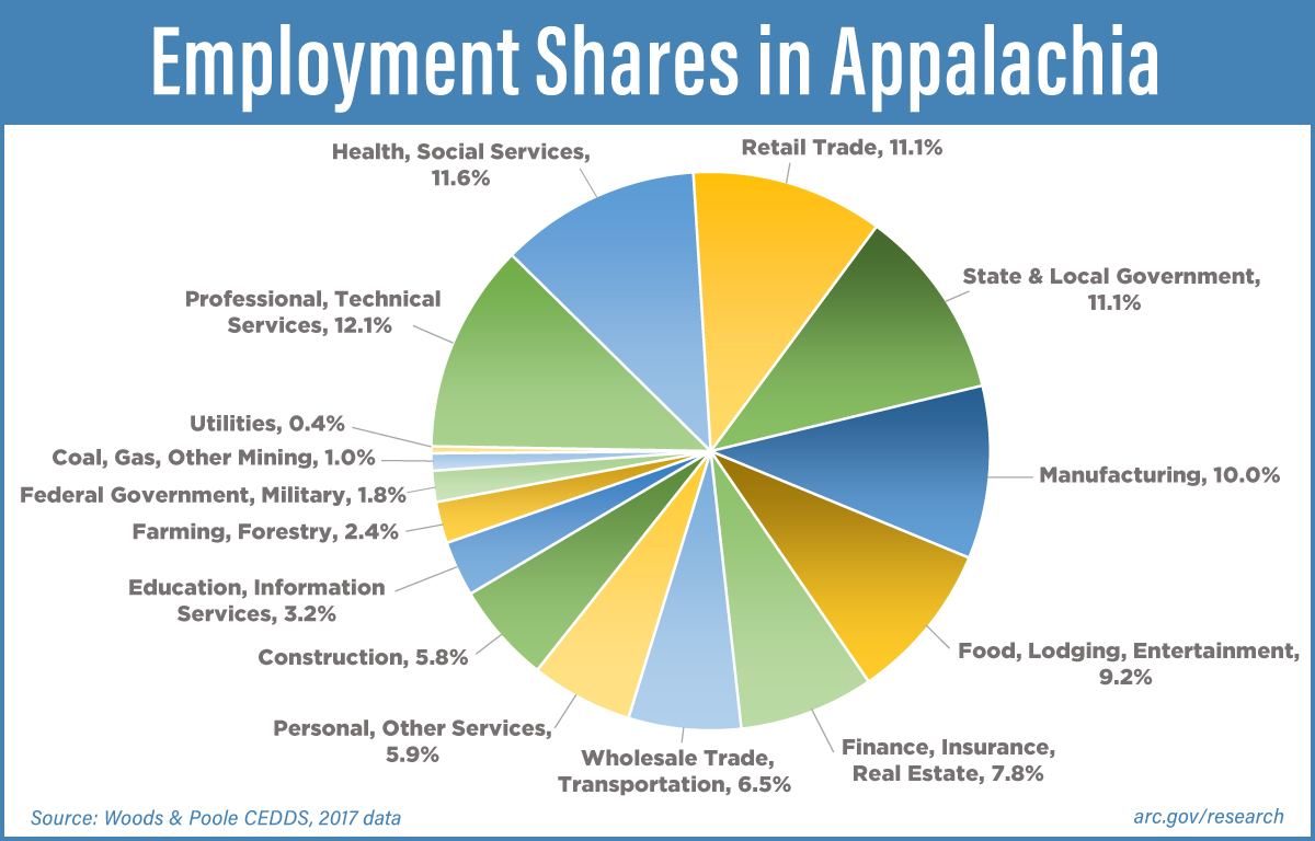 - In 2017, 10 percent of Appalachia’s total employment was in the manufacturing industry, a larger share than the country as a whole (6.8 percent).