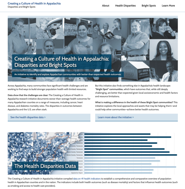 “Creating a Culture of Health in Appalachia: Disparities and Bright Spots” is an innovative research initiative sponsored by the Robert Wood Johnson Foundation (RWJF) and the Appalachian Regional Commission (ARC) and administered by the Foundation for a Healthy Kentucky. This multi-part health research project will, in successive reports: measure population health and document disparities in health outcomes in the Appalachian Region compared to the United States as a whole, as well as disparities within the Appalachian Region; identify “Bright Spots,” or communities that exhibit better-than-expected health outcomes given their resources; and explore a sample of the Bright Spot communities through in-depth, field-based case studies. Taken together, these reports will provide a basis for understanding and addressing health issues in the Appalachian Region. This research initiative aims to identify factors that support a culture of health in Appalachian communities and explore replicable activities, programs, or policies that encourage better-than-expected health outcomes that could translate into actions that other communities can replicate.